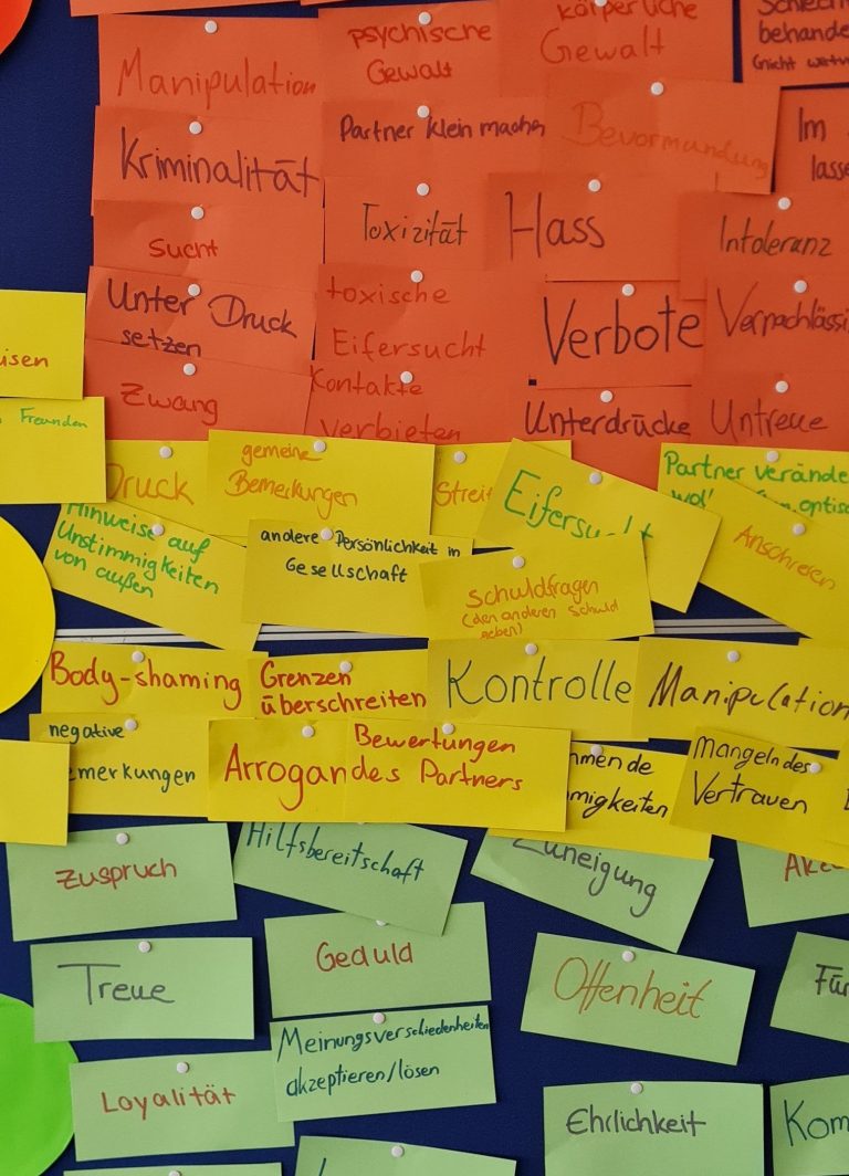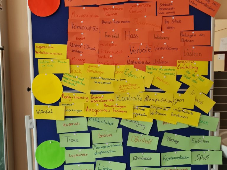 Wir führen Präventionsveranstaltungen an Schulen durch, um der Gewalt in Beziehungen schon früh vorzubeugen. In fünf Unterrichtsstunden werden im Klassenverband wichtige Fragen zum Thema Liebe und Beziehung erarbeitet.